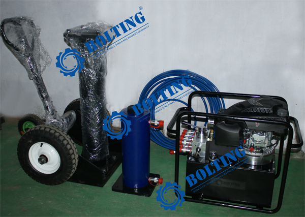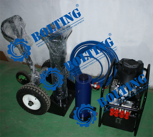 近日為河南某重工企業定制的移動式液壓駕車機準備發貨,因客戶現場工況受限,采用汽油發動機動力液壓泵作為動力源,配備移動駕車機,50T通用型雙作用液壓千斤頂和10m的雙聯液壓油管,簡便快捷的解決了重物頂升問題。