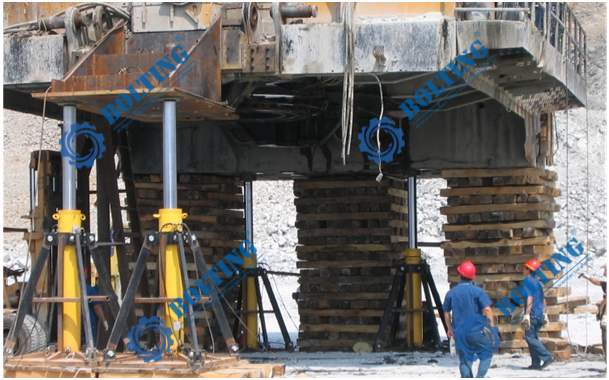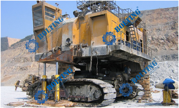 已知所需頂升設(shè)備為礦用電鏟,對(duì)電鏟進(jìn)行回轉(zhuǎn)支承維護(hù)等工作,總重量約為1000噸,需更換履帶行走裝置、回轉(zhuǎn)裝置等部件,就需要將整機(jī)同步頂升,平穩(wěn)的頂起到一定的高度,便于現(xiàn)場(chǎng)的檢修,頂升過(guò)程中需保證不損壞整機(jī)結(jié)構(gòu),也需使其均衡受力。